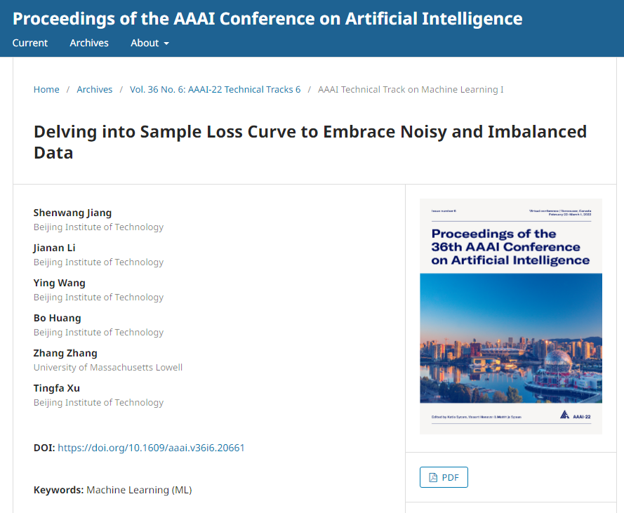 近日,北京理工大学香港彩霸王 许廷发科研团队在机器视觉分类中噪声和长尾数据处理方面取得新进展,相关研究成果以“Delving into Sample Loss Curve to Embrace Noisy and Imbalanced Data”为题被人工智能领域的国际顶级会议AAAI-2022 (CCF A)发表,AAAI是人工智能领域具有高影响力的国际顶级学术会议之一,被计算机协会归类为A类会议,主要发表和报道计算智能、人工智能、数据科学和深度学习等领域的最新研究进展和技术。该工作第一作者为北京理工大学博士后江慎旺,通讯作者为北京理工大学李佳男特别副研究员和许廷发教授。