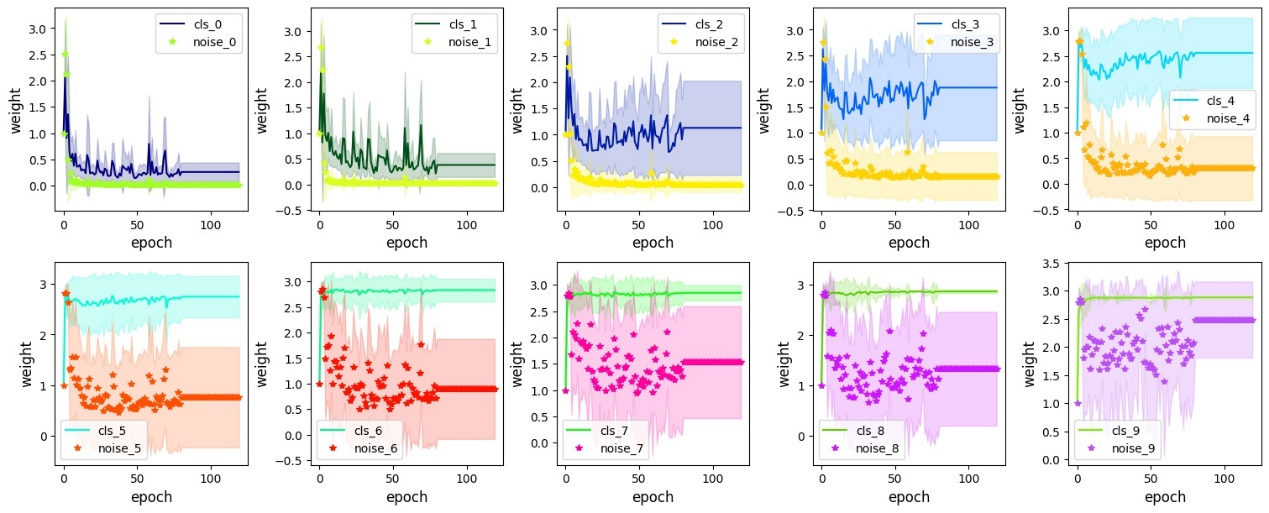 图3为生成的权重曲线的可视化分析。在权重曲线中,干净样本和尾部被赋予较高的权重,而噪声样本和头部样本被赋予较低的权重。这种重赋权策略可以有效的抑制噪声数据的影响并提升模型对尾部数据的学习能力。