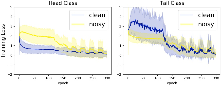 随着人工智能的发展,如何在噪声和长尾数据中训练模型在机器学习中引起了很多关注。然而,当前大多数方法都在理想化的状态下研究如何单独处理噪声或者长尾数据的问题,针对这一科学问题,北京理工大学许廷发教授团队率先提出损失值曲线和元学习的方法同时解决噪声和长尾数据,通过大量的计算和实验观察发现,虽然从单个的权重无法区分噪声和尾部样本,但是在样本的整个训练过程生成的损失值曲线能够提供充足的信息区分这两种样本,如图1。