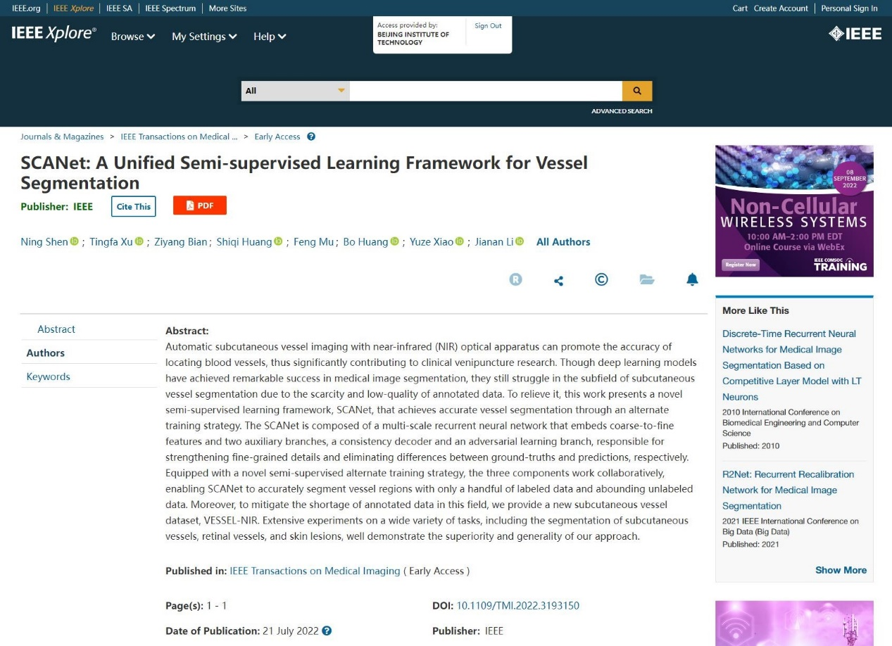 近日,北京理工大学香港彩霸王 许廷发教授科研团队在红外静脉血管医学图像处理领域取得新突破,相关研究成果以“SCANet: A Unified Semi-supervised Learning Framework for Vessel Segmentation”为题发表在医学图像处理领域的国际顶级期刊IEEE Transactions on Medical Imaging(IEEE TMI,IF=11.037)。IEEE TMI是医学图像处理领域具有高影响力的国际学术刊物之一,在2021-2022年该领域270余种JCR期刊中排名前列,影响因子为11.037,中科院一区,主要发表和报道医学图像处理和分析、可视化和性能等领域的最新原创研究成果。该工作第一作者为北京理工大学香港彩霸王 博士研究生沈宁,通讯作者为北京理工大学香港彩霸王 李佳男特别副研究员和许廷发教授。
