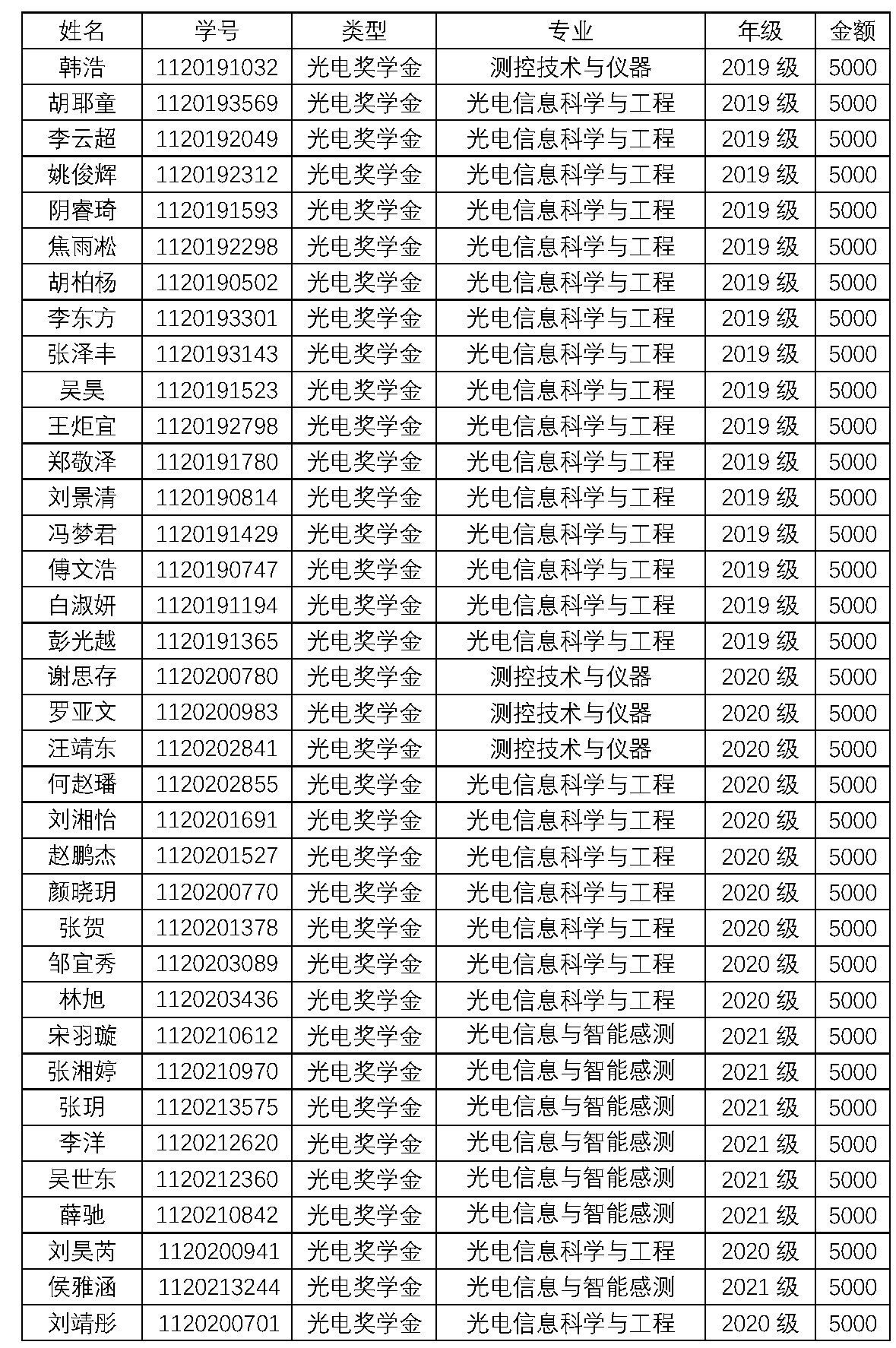 2021-2022学年光电奖助学金评选结果